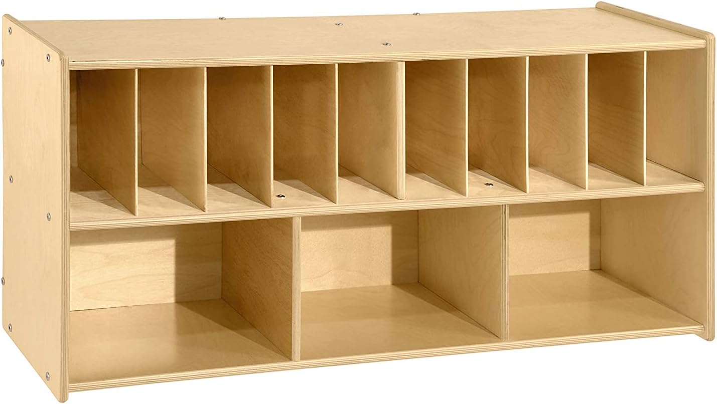 Easily create extra storage space for your room with this Contender Wall Mountable Diaper Storage. This station has 10 small storage slots perfect for diapers, nappies and other kids essentials. Below, there are three larger cubbies great for bottles, powder and other supplies. Constructed from 100% Baltic Birch plywood with eased edges and coated with our exclusive Tuff-Gloss UV Finish making it resistant to stains and durable for any classroom or home settings. The mortise & steel fasteners provide exceptional joint strength and durability. This product is GREENGUARD Gold certified for non-toxic emissions and air quality. The unit's dimensions: 21 1/4"H x 46 3/4"W x 12"D. The unit's is weight: 49lbs. The small cubbies dimensions: 9 3/16"H x 4 3/8"W. The large cubbies dimensions: 9 3/16"H x 14 3/4"W. This item comes flat packed and is ready to be assembled! This unit does not come with mounting hardware. The Contender Wall Mountable Diaper Storage is proudly made in the U.S.A. with a lifetime warranty.