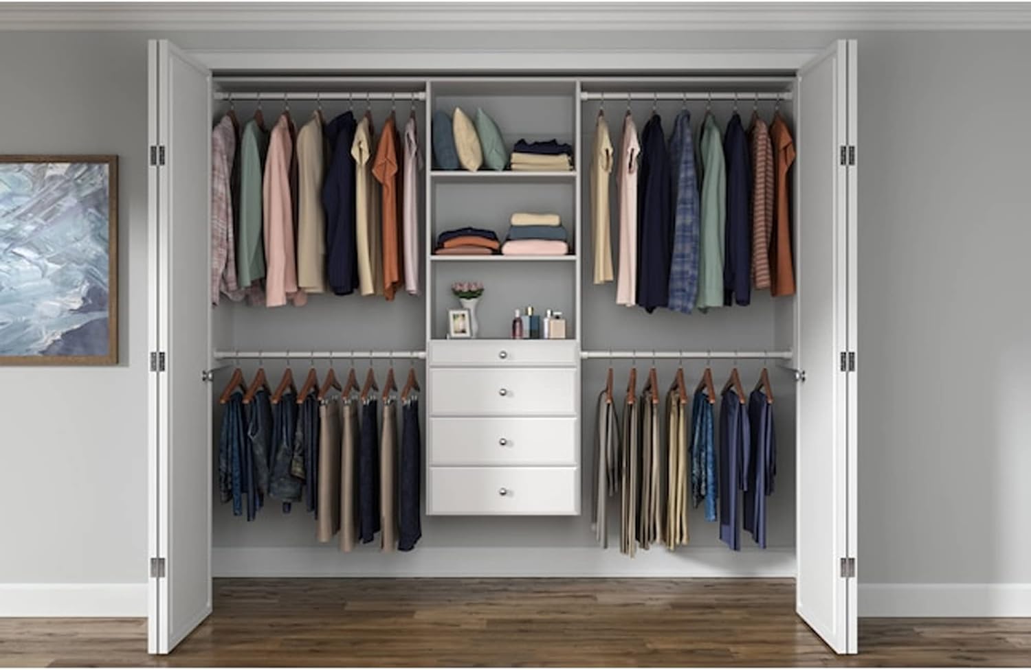 Easy Track OK7272 Deluxe Tower Closet Storage Wall Mounted Wardrobe Organizer Kit System with Shelves and Drawers for Bedroom with Hardware, White