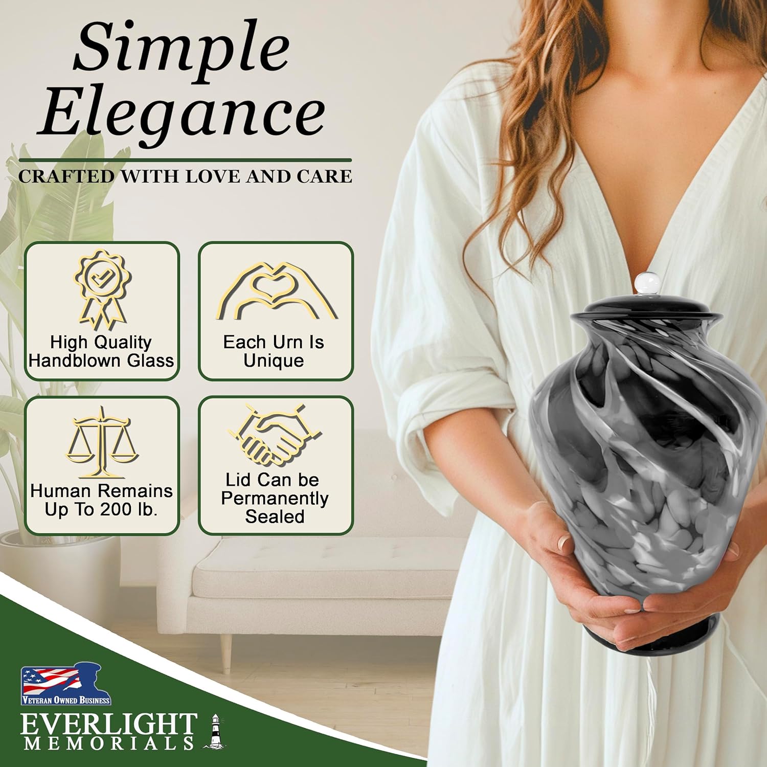 Hand Blown Glass Urn for Ashes Adult Male – Large Cremation Urns for Human Ashes – Memorial Funeral Urn for Men & Women, Home Display, or Burial (Black/Silver, Adult)